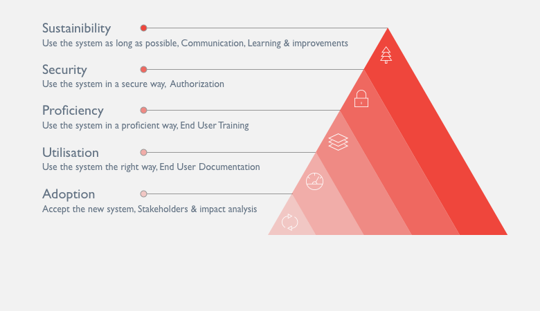 Vous vous attendez à ce qu'un nouvel outil logiciel apporte de la valeur lors de sa mise en œuvre. Cependant, la performance technologique du logiciel à elle seule n'est pas une garantie de succès. Les utilisateurs doivent également accepter la solution et l'utiliser de manière optimale tout au long de son cycle de vie. Ce n'est que lorsque ces conditions sont remplies que la valeur réelle de vos investissements sera débloquée. Ce n'est qu'alors que l'outil et le capital humain se renforceront mutuellement.